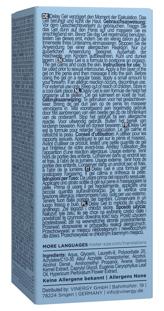 Delay Gel di Mister Size è pensato per aiutare a prolungare il piacere maschile senza rinunciare alle sensazioni. La formula leggera unisce ingredienti efficaci e delicati sulla pelle: laureth-9 e olio di chiodi di garofano aiutano a ridurre la sensibilità, mentre un leggero effetto rinfrescante offre maggiore controllo. Gli estratti lenitivi di iperico e avena calmano la pelle per un comfort superiore. Facile da applicare, si assorbe rapidamente ed è compatibile con preservativi e sex toys.