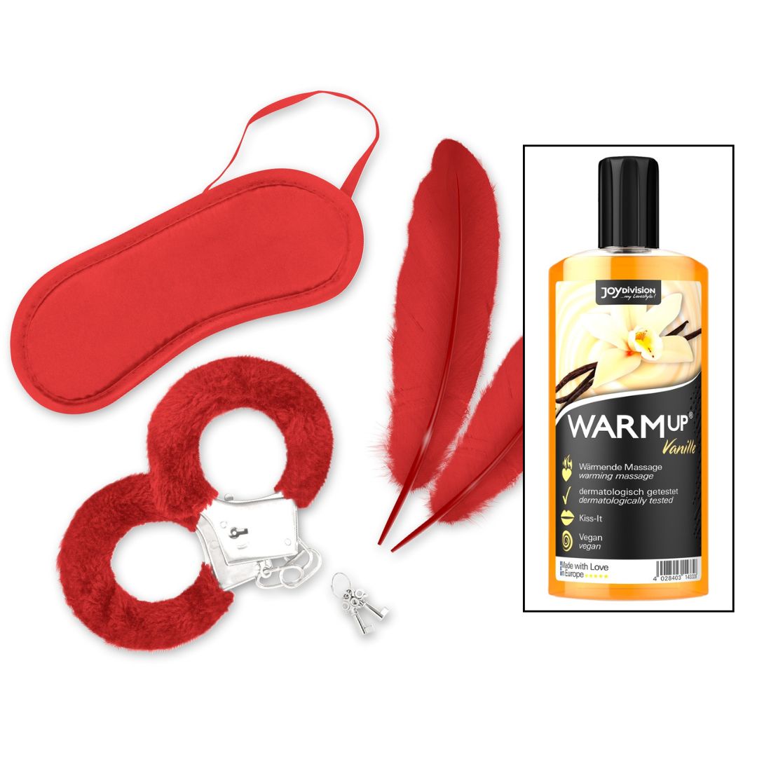 Composto da una bendina per gli occhi, un paio di manette di metallo con copertura in peluche e due leggere piume d'oca.