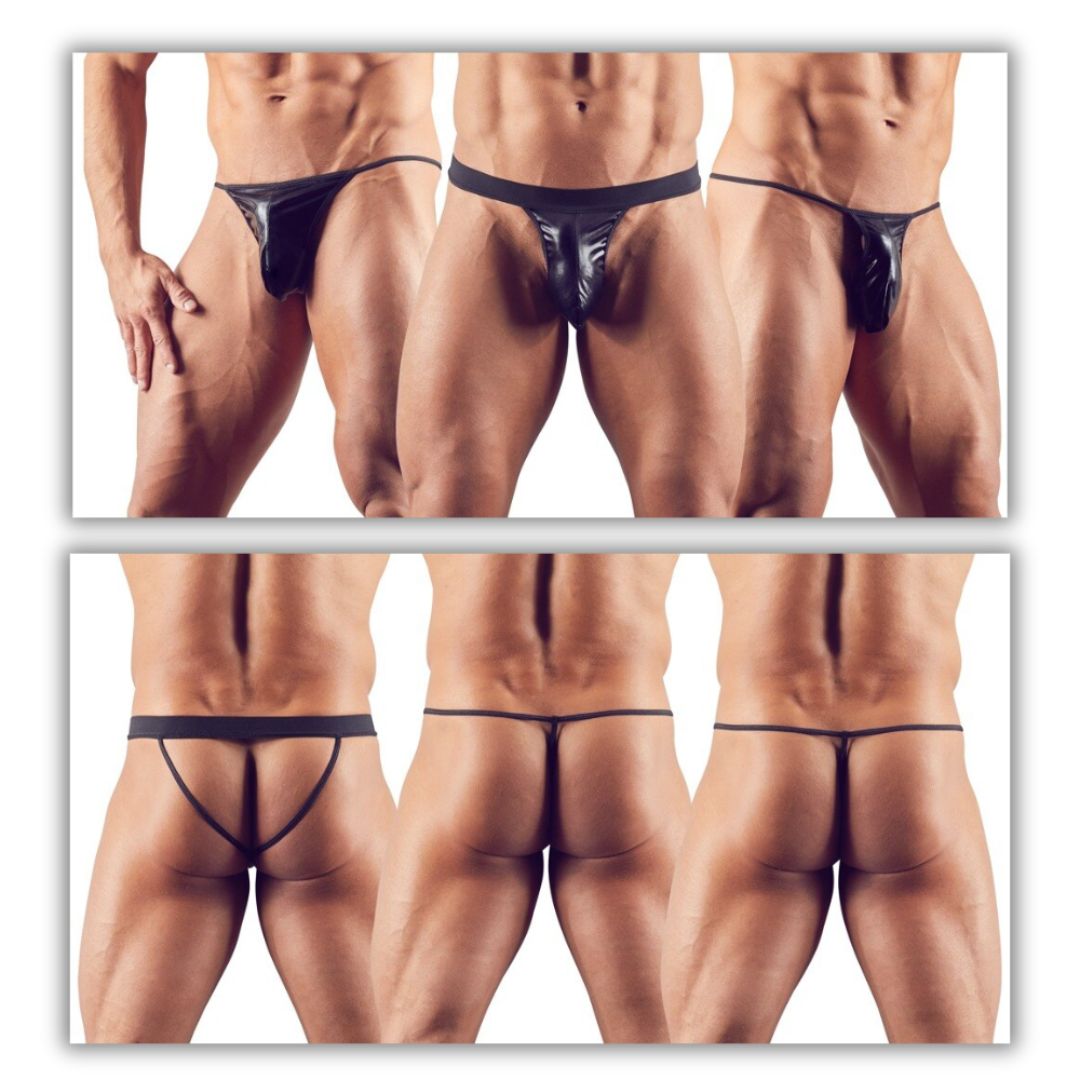 Questo set di mini string di Svenjoyment è perfetto per chi desidera un look audace e seducente. Il set include tre diversi modelli: un mini string, un mini perizoma G-string e un jock, tutti realizzati in un tessuto nero effetto bagnato estremamente brillante e provocante.